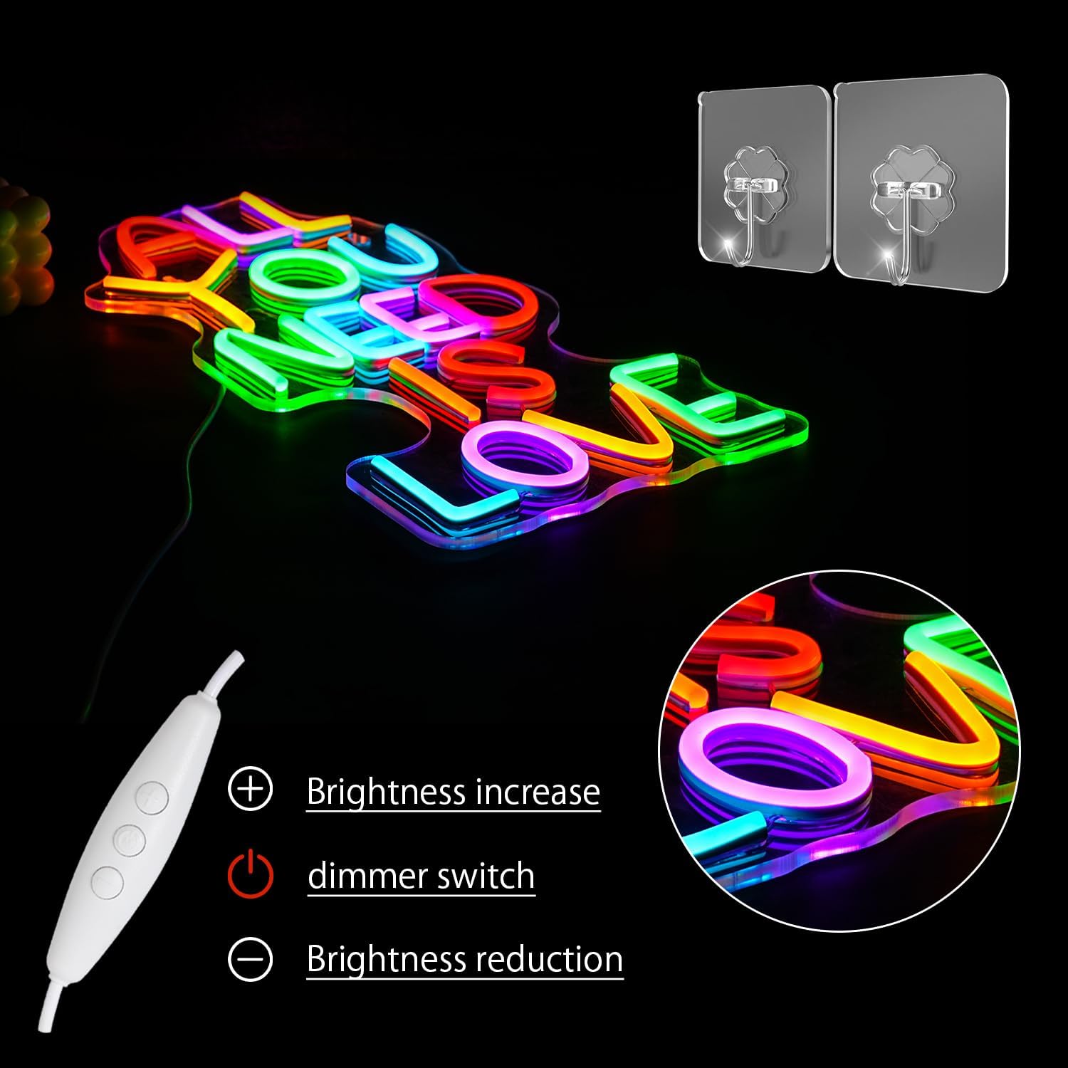 Includes two pre-drilled holes, a sturdy hanging chain, and hooks for effortless wall mounting. Just plug in the USB cable to any power source and adjust the brightness to your liking with the dimmable switch.