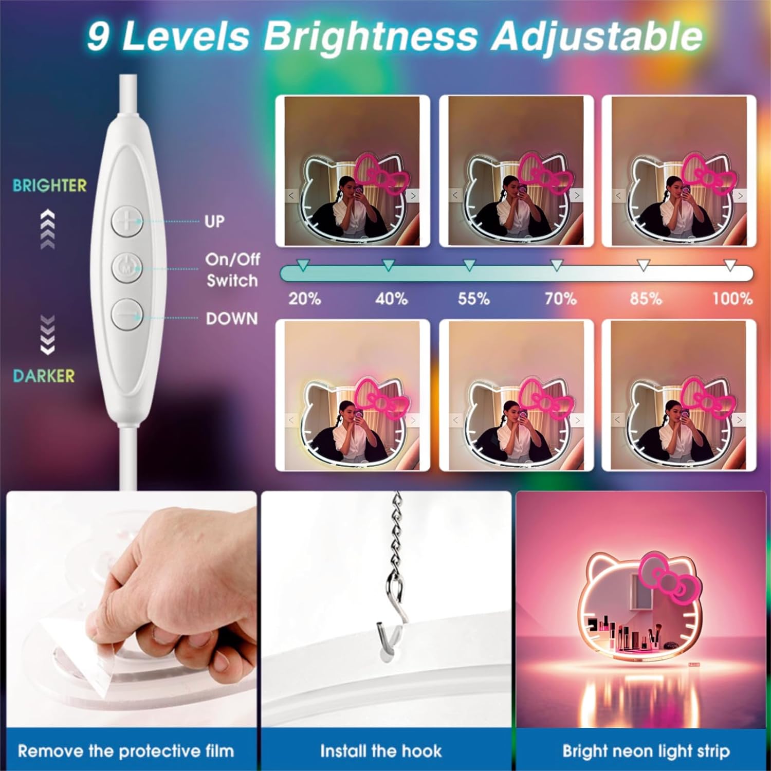 Add a playful yet romantic glow to your space with this stylish pink neon mirror featuring a charming cat and hair clip design. The LED-lit outline gives your wall an aesthetic pop that’s both cute and modern.