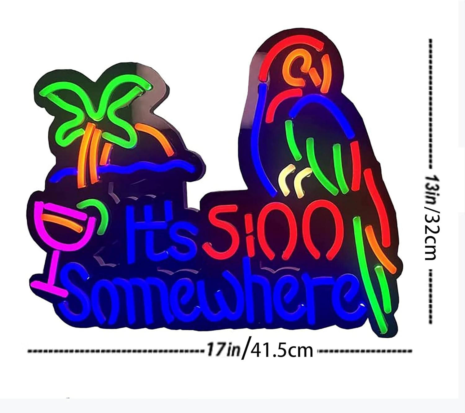 It's 5 O'Clock Somewhere Neon Sign with Parrot and Palm Tree – Custom LED Wall Decor for Home Bar, Pub, Game Room, Man Cave, or Bedroom – Personalized Beach-Themed Light for Parties, Birthdays, and Gifts for Men