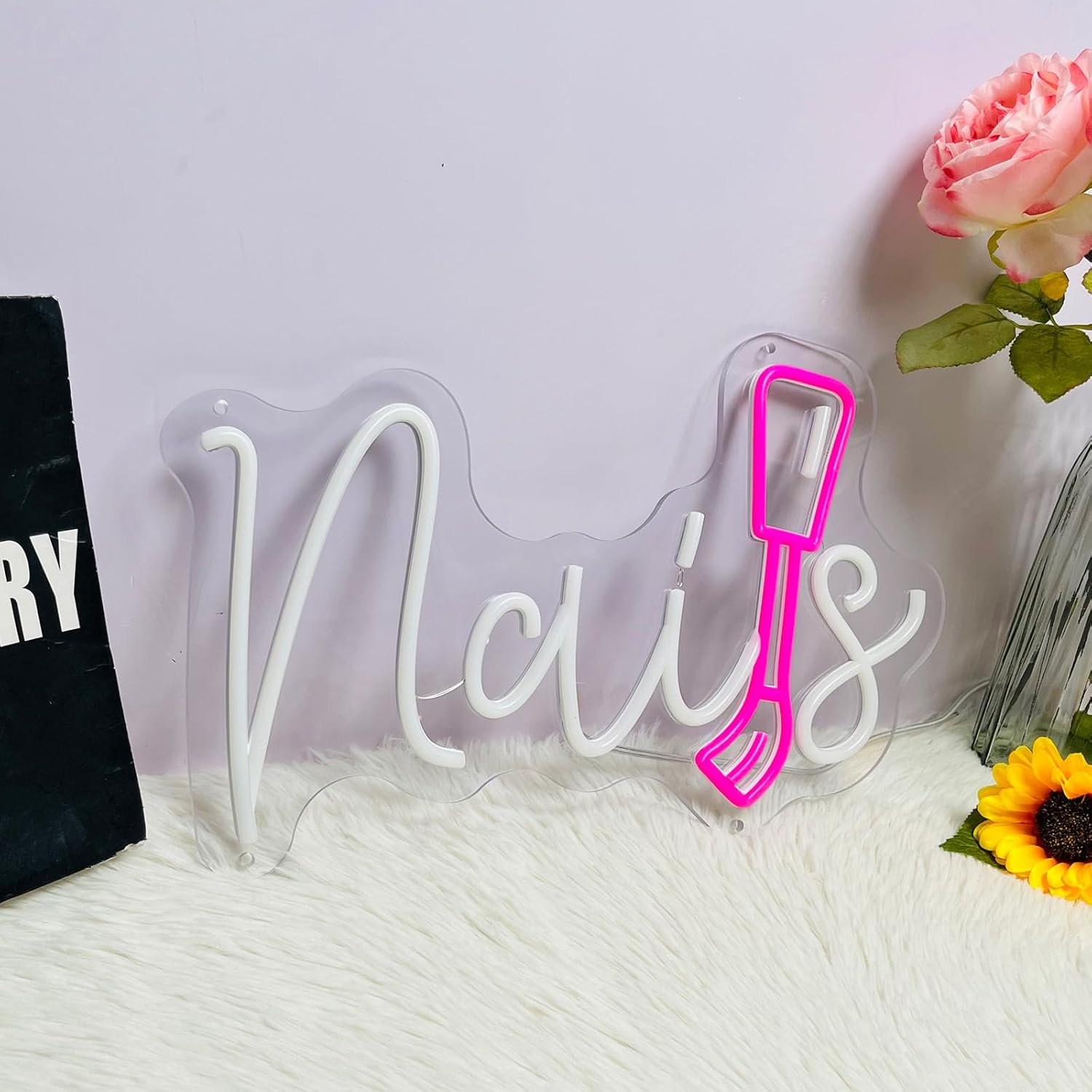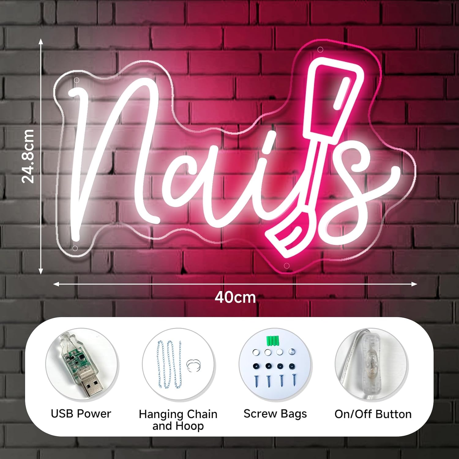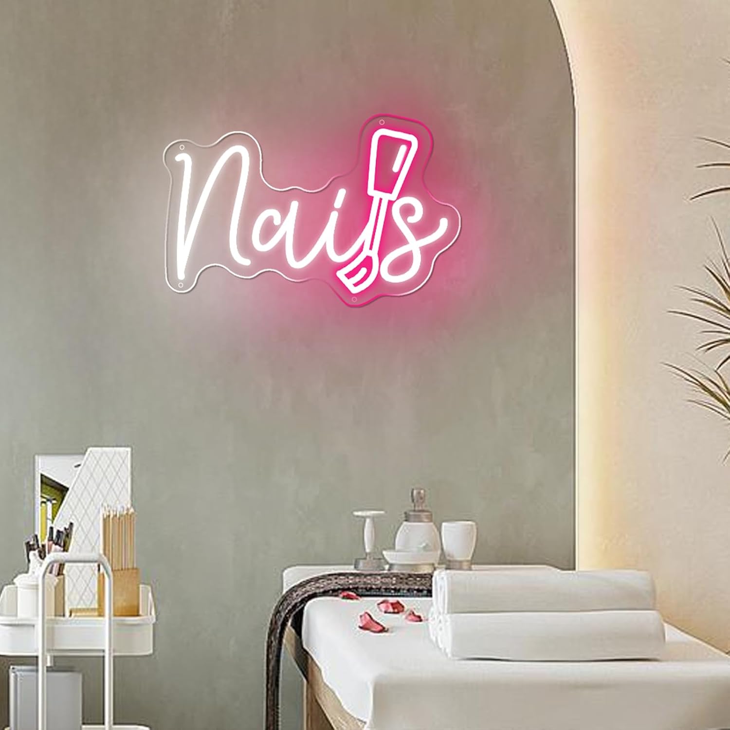 Add a pop of personality to your nail salon or beauty space with this eye-catching LED neon sign featuring vibrant white lettering and a stylish pink nail polish graphic. It’s the perfect centerpiece to attract customers and elevate your décor.