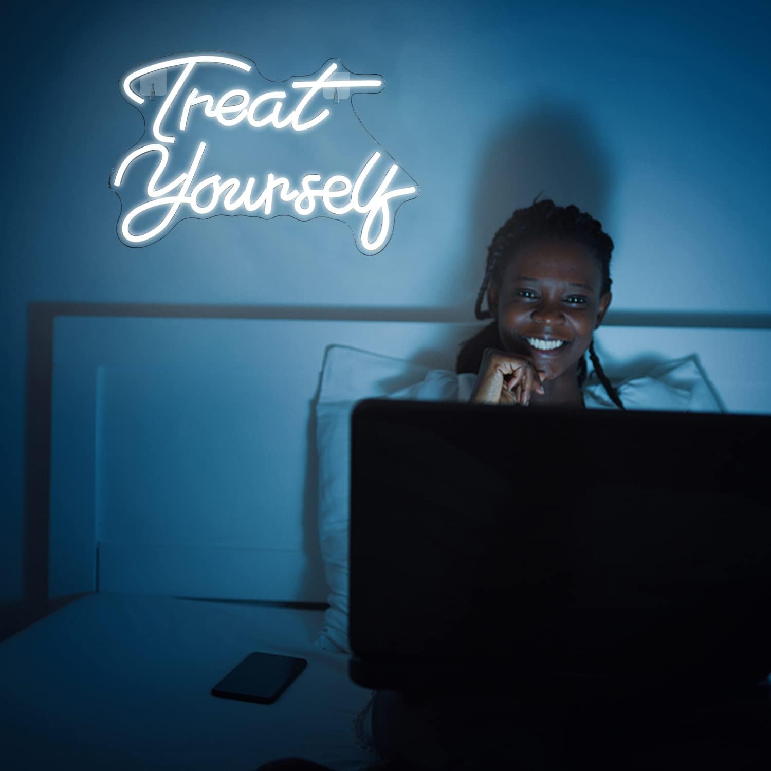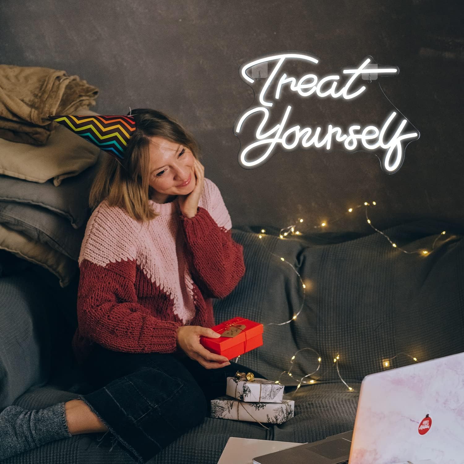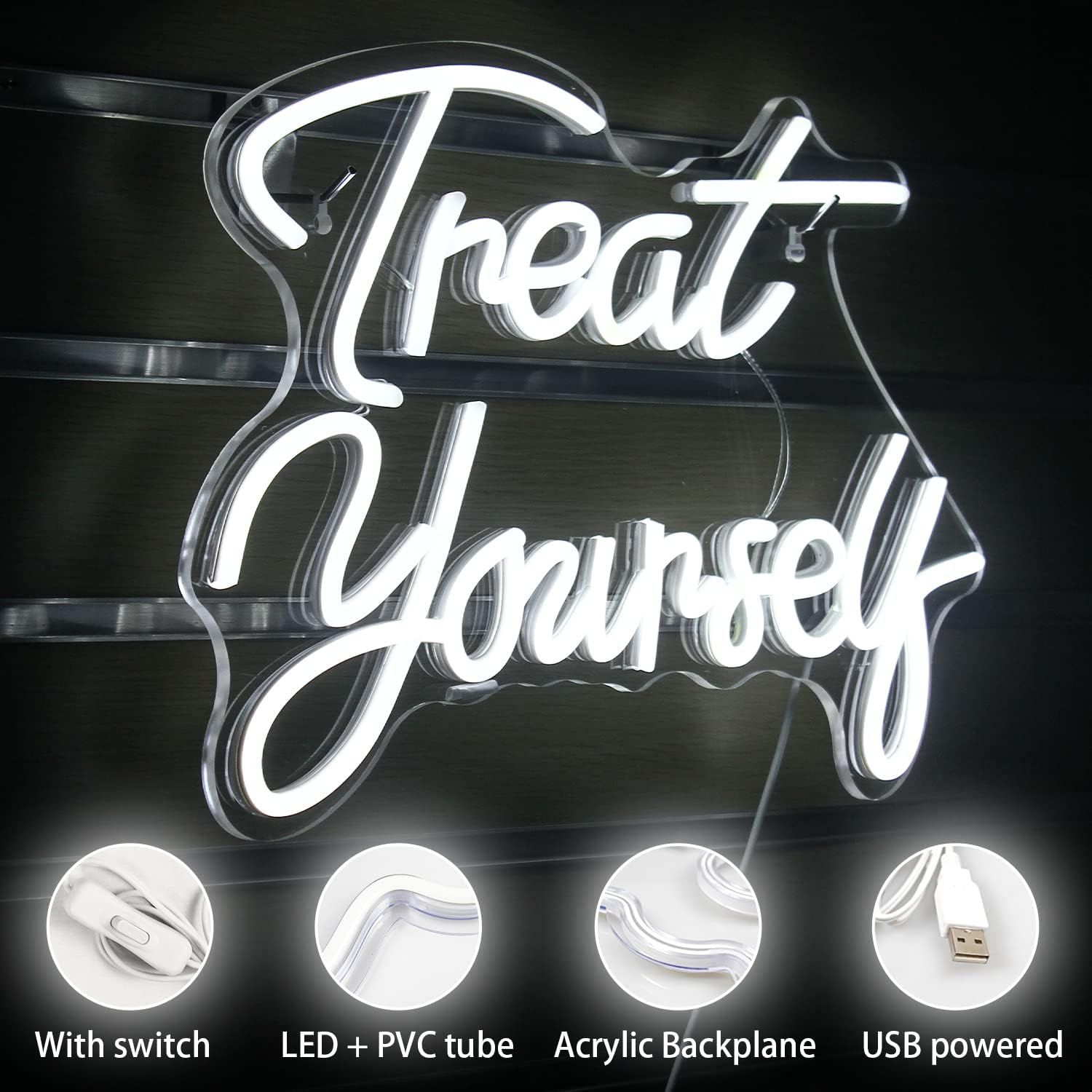 The WANXING “Treat Yourself” white word neon sign features a sleek, 3D letter design that emits a soft glow, perfect for elevating the vibe of any room. Whether it’s your bedroom, living room, or office, this sign adds a touch of modern charm and cozy ambiance.